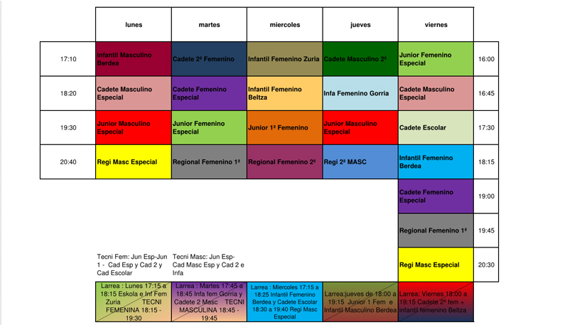 La parte central del cuadro son los entrenamientos que se desarrollarán en Ixerbekoa y que en la parte inferior son aquellos que tendrán lugar en el Polideportivo de Larrea.